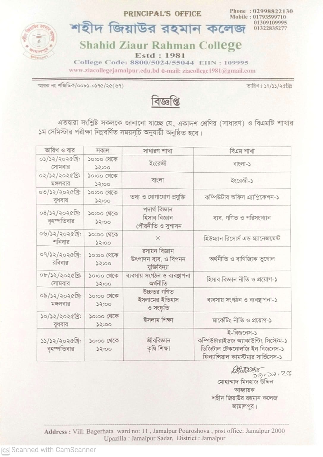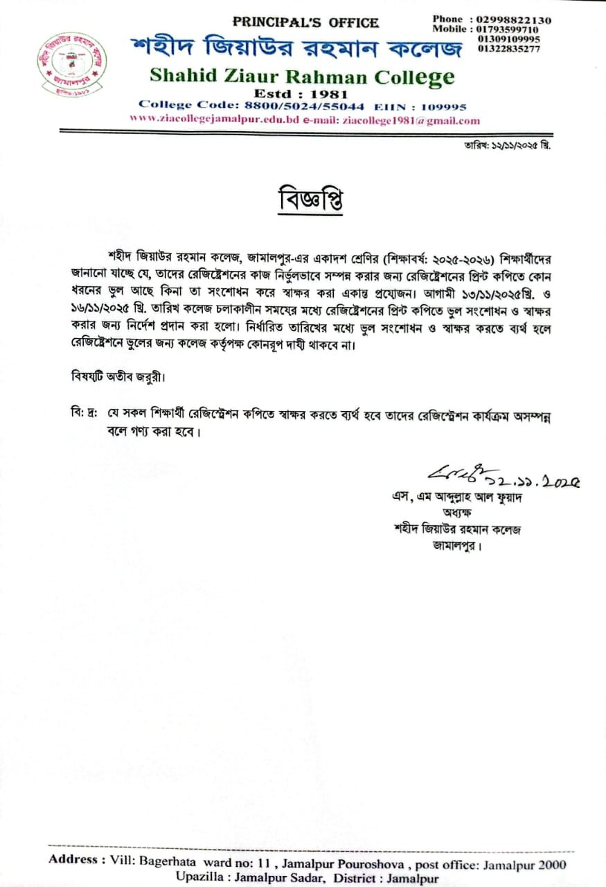 একাদশ শ্রেণির (২০২৫-২৬ শিক্ষাবর্ষ) সাধারণ ও বিএমটি শাখার ১ম সেমিস্টার পরীক্ষার রুটিন প্রকাশ করা হয়েছে।                   উচ্চমাধ্যমিক(২০২৫-২৬ শিক্ষাবর্ষ)একাদশ শ্রেণির ছাত্রছাত্রীদের রেজিস্ট্রেশন কার্যক্রম চলছে।                   উচ্চ মাধ্যমিক (সাধারণ শাখা) বর্ষ সমাপণী পরীক্ষা ২০২৫ এর ফলাফল প্রকাশ করা হয়েছে। বিস্তারিত জানতে ফলাফল মেনুর অভ্যান্তরিন ফলাফল বাটনে ক্লিক করুন।                   উচ্চ মাধ্যমিক পর্যায়ে একাদশ (সাধারণ শাখা ও কারিগরি শাখা) শ্রেণিতে ভর্তি হতে ইচ্ছুক সকল শিক্ষার্থীদের কলেজ শিক্ষা পরিবারের পক্ষ থেকে আন্তরিক শুভেচ্ছা জানাচ্ছি। এস,এম আব্দুল্লাহ আল ফুয়াদ , অধ্যক্ষ , শহীদ জিয়াউর রহমান কলেজ,জামালপুর।
